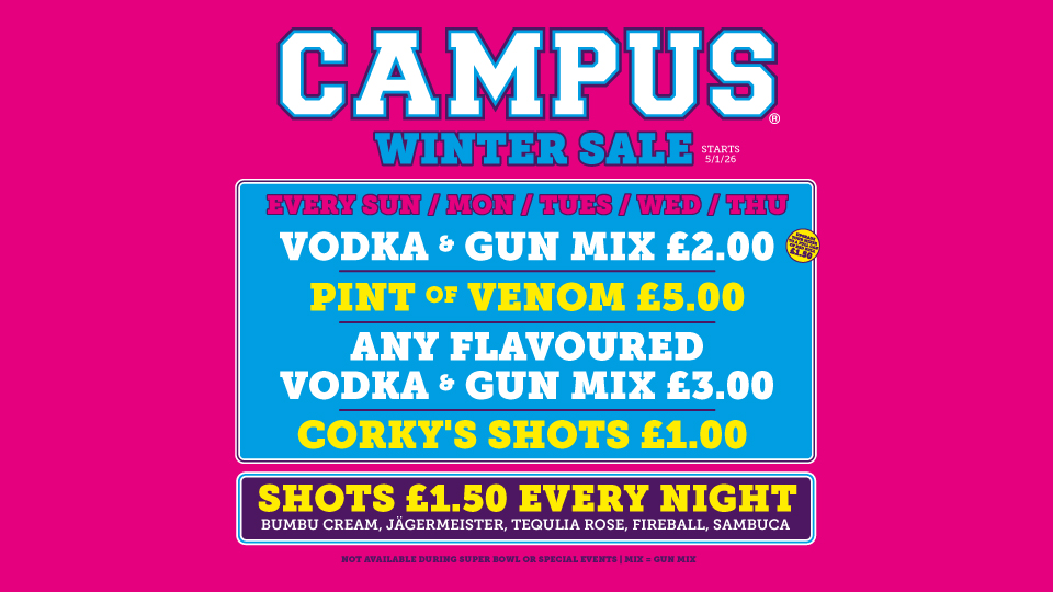 Welcome to Campus – a slice of American college life, right here, in the centre of town. We're open 7 days a week from 12pm entertainment every night, quizzes, games and special events. Campus shows all the big football matches live on our big screens and our booths can be booked for you and your friends. To make a booking call us on 0141 332 3994.